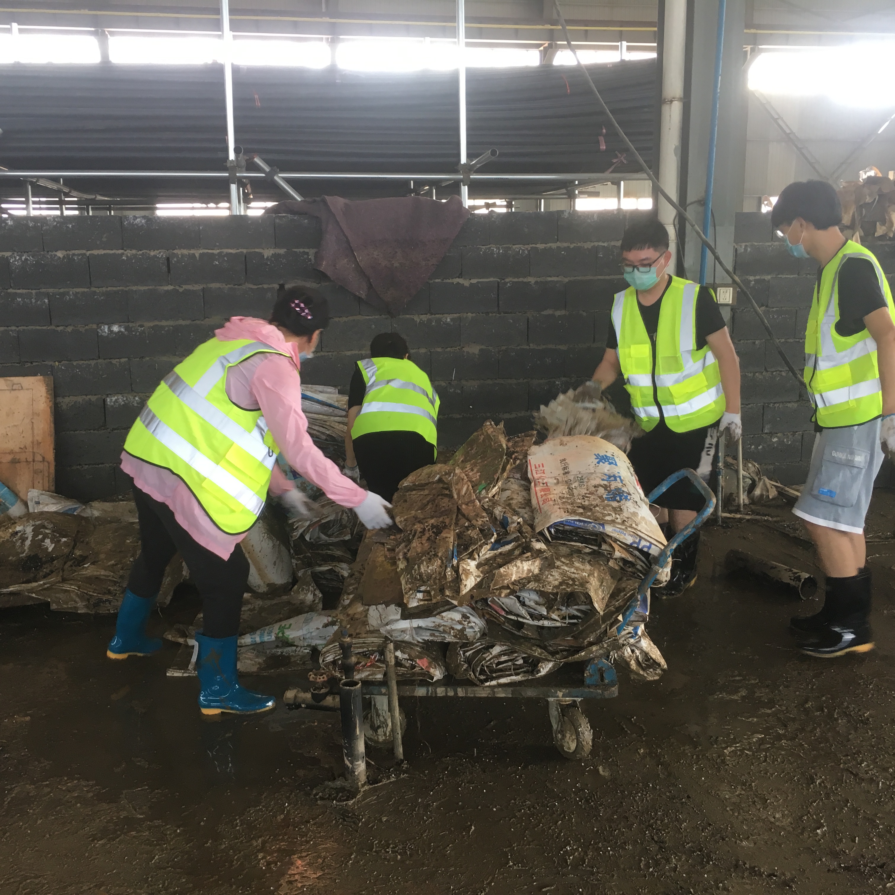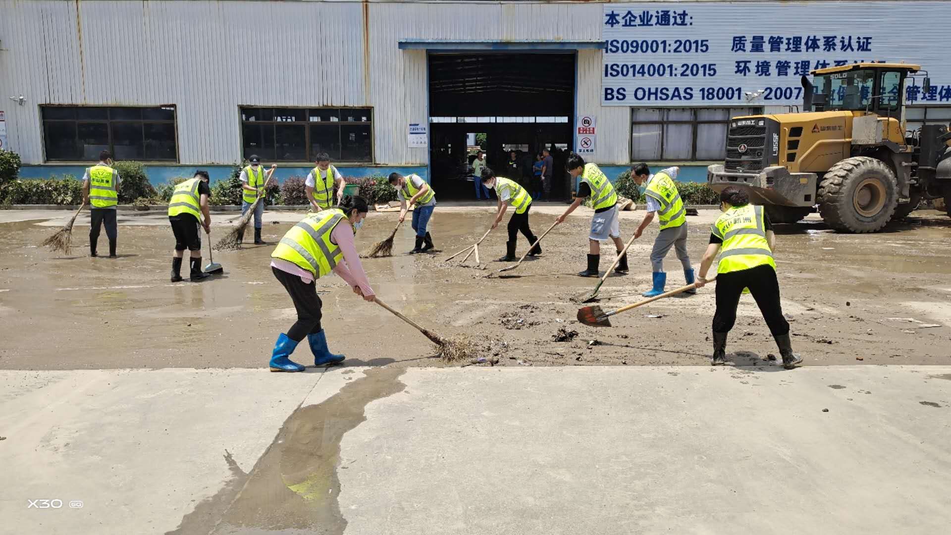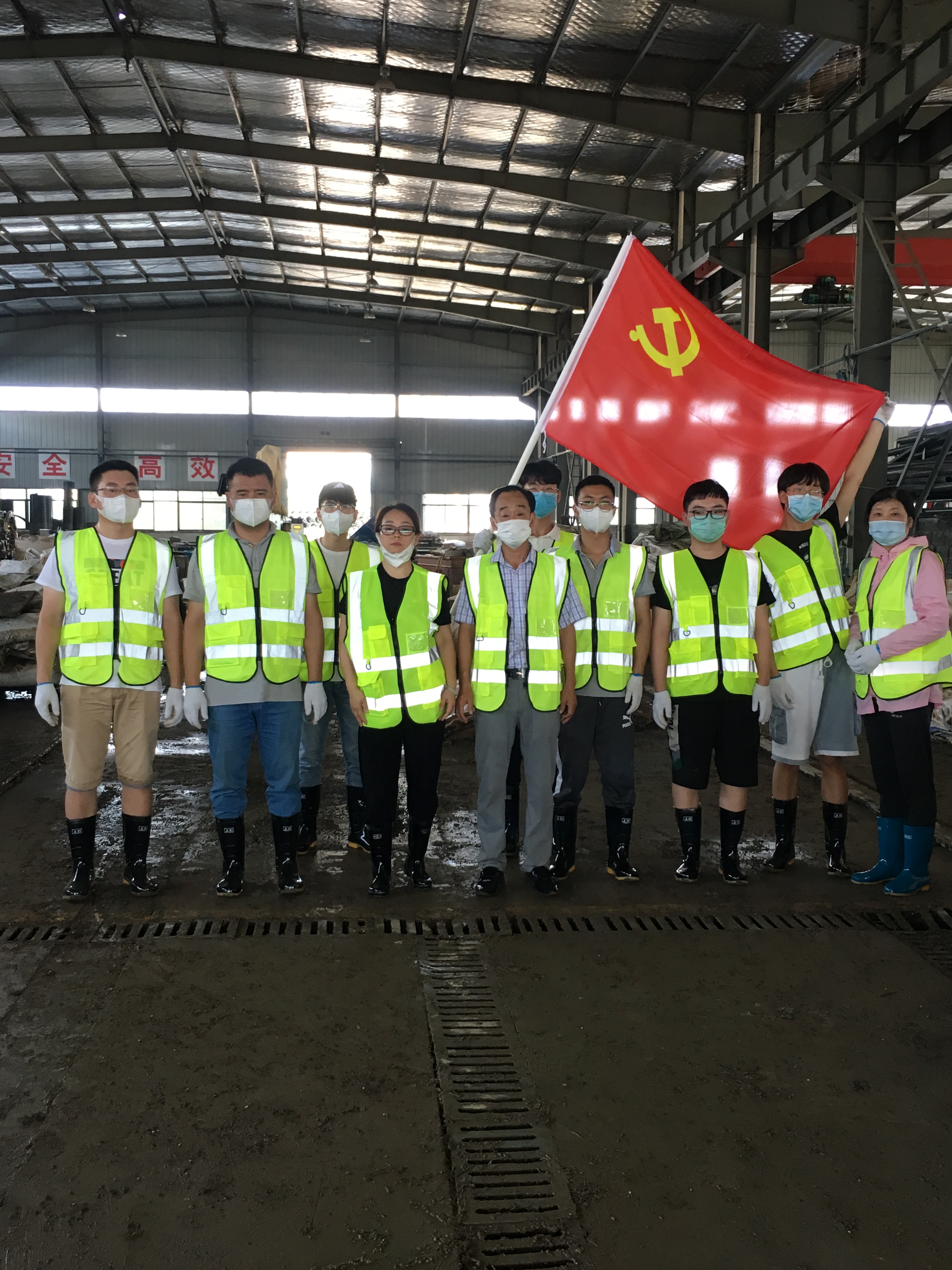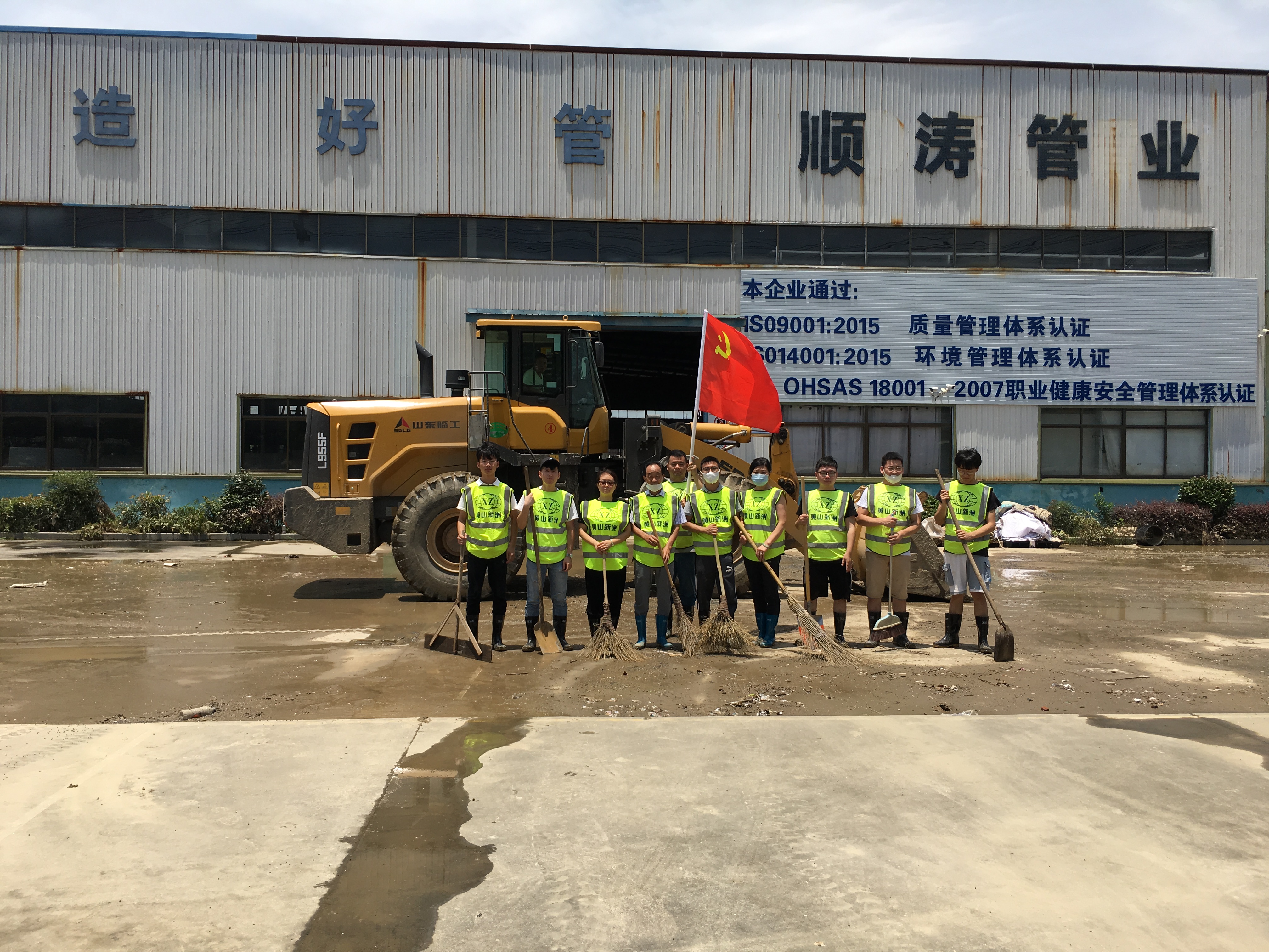 上午8時(shí)許,黃山新洲公司黨員、入黨積極分子、抗洪搶險(xiǎn)志愿者開著鏟車、灑水車從屯溪區(qū)出發(fā)到達(dá)歙縣經(jīng)開區(qū)受澇嚴(yán)重的黃山順濤管業(yè)有限公司進(jìn)行衛(wèi)生清掃,先清理垃圾及淤泥,再進(jìn)行集中消毒消殺。烈日炎炎,新洲支部的黨員志愿者們個(gè)個(gè)不怕臟,不怕累,頂著烈日,揮汗如雨。通過一個(gè)上午的勞動(dòng),在人機(jī)配合下,掃除了垃圾,清除了表面泥土,受災(zāi)企業(yè)的工作環(huán)境煥然一新。