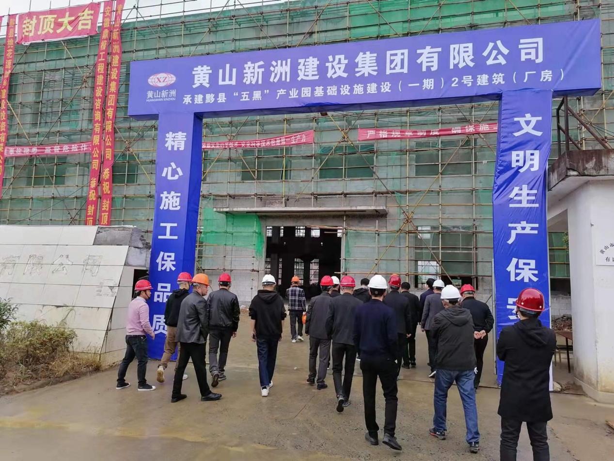 2021年11月5日上午,黟縣縣委書記葉建明一行人蒞臨公司承建的黟縣“五黑”產(chǎn)業(yè)園基礎設施建設(一期)2號建筑(廠房)施工現(xiàn)場進行檢查調(diào)研。