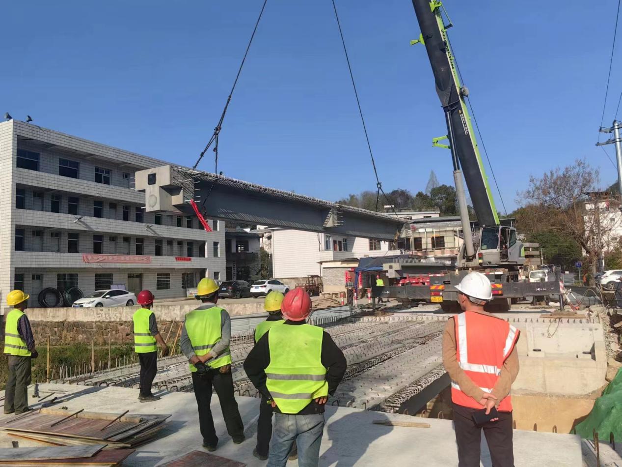架設(shè)過程中我公司安全分管副總張遠林、歙縣公路局領(lǐng)導(dǎo)全程在現(xiàn)場統(tǒng)籌指揮;我公司安全部和歙縣交警隊,負責(zé)對現(xiàn)場交通進行指揮管理,保障吊裝作業(yè)過程中的生產(chǎn)安全。
